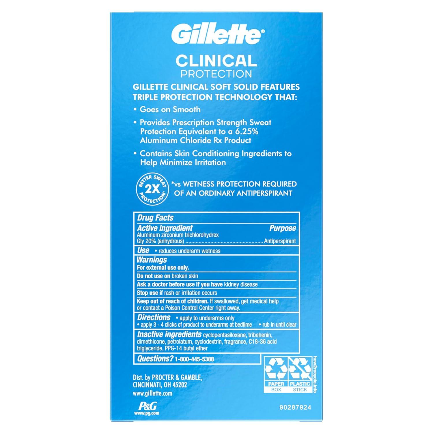 CLINICAL STRENGTH – Gillette Clinical soft solid features triple protection technology that provides prescription strength sweat protection equivalent to a 6.25% aluminum chloride Rx product