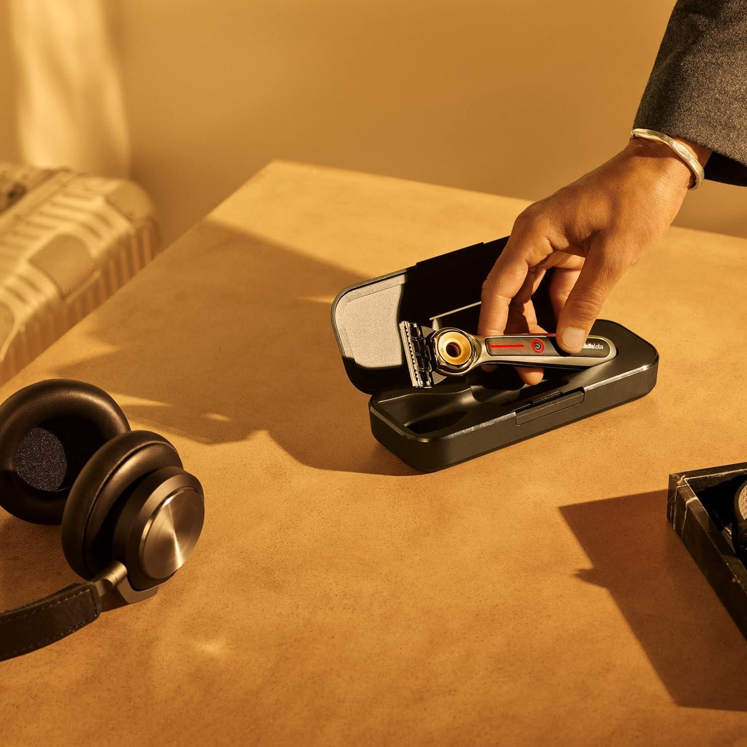The Heated Razor by GilletteLabs offers the soothing luxury of a hot towel shave with every stroke. Designed to quickly and evenly warm skin and maintain a soothing temperature throughout your shave, this razor helps turn a daily task into a welcoming experience. The warming bar heats up in less than a second and is designed with an adjustable temperature for you to easily choose between two levels of heat (109 degrees F and 122 degrees F) to achieve optimal comfort. It has four intelligent heat sensors that allow the razor to maintain a safe and consistent warmth, while five blades ensure a comfortable, close shave. FlexDisc technology contours to your facial features to ensure contact with the warming bar on each stroke. The razor is fully waterproof and designed with a premium grade aluminum zinc handle. It charges on a wirelessly on a magnetic stand so it's ready when you are.