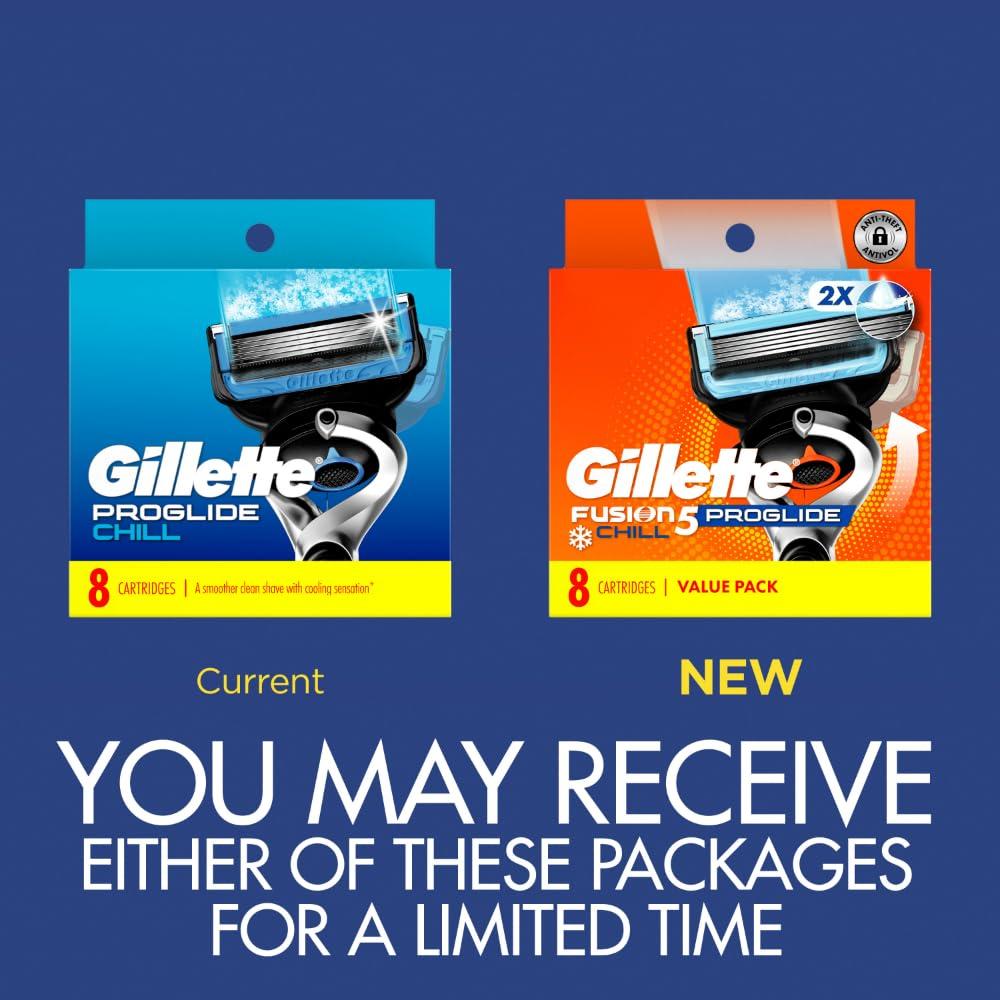 The Gillette ProGlide Chill men's razor comes with lubrication that hugs the blades, and shields skin from irritation while you shave, giving you uncompromising closeness and comfort. This razor for men provides shaving precision and 5 blades for a smoother, clean shave*. The blades are spaced optimally for impeccable comfort. Enjoy the precision trimmer on the back for hard-to-reach places and for styling your facial hair just the way you want it. The lubrication before & after the blades helps shield your skin from irritation while you shave. This blue Lubrastrip gives a cooling, refreshing sensation during your shave and also fades when you are no longer getting an optimal shave. Enjoy soft microfins that gently stretch and smooth your skin, while a microcomb helps guide your hair for a close shave with our thinnest blades. The ProGlide Chill razor for men features our sharpest blades (first 4 blades) which help get virtually every hair effortlessly. One razor blade refill lasts up to 20 shaves. Concerned your Gillette handle won't fit? All ProShield blade refills can fit all Gillette 5 blade razor handles (excluding GilletteLabs). (*Vs. Fusion5)