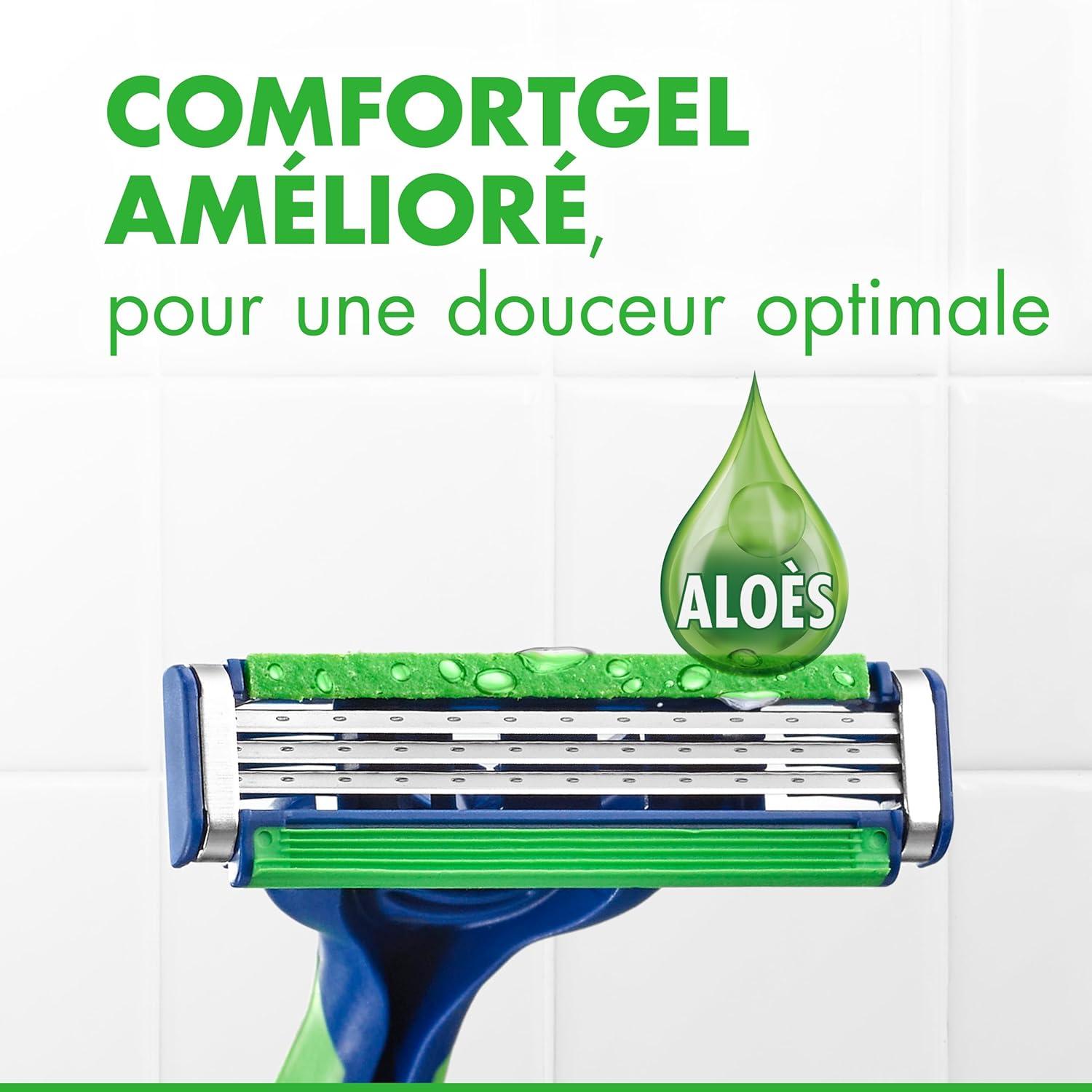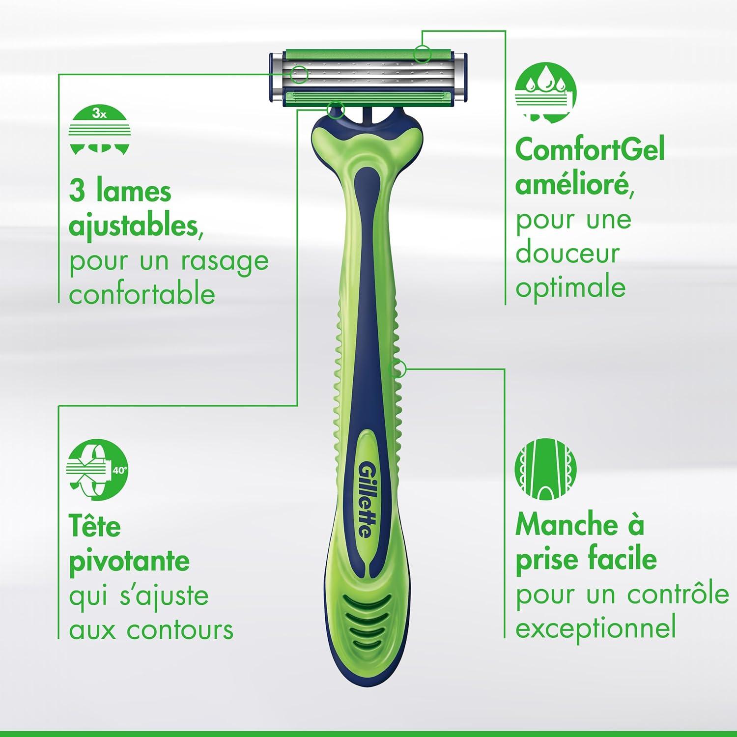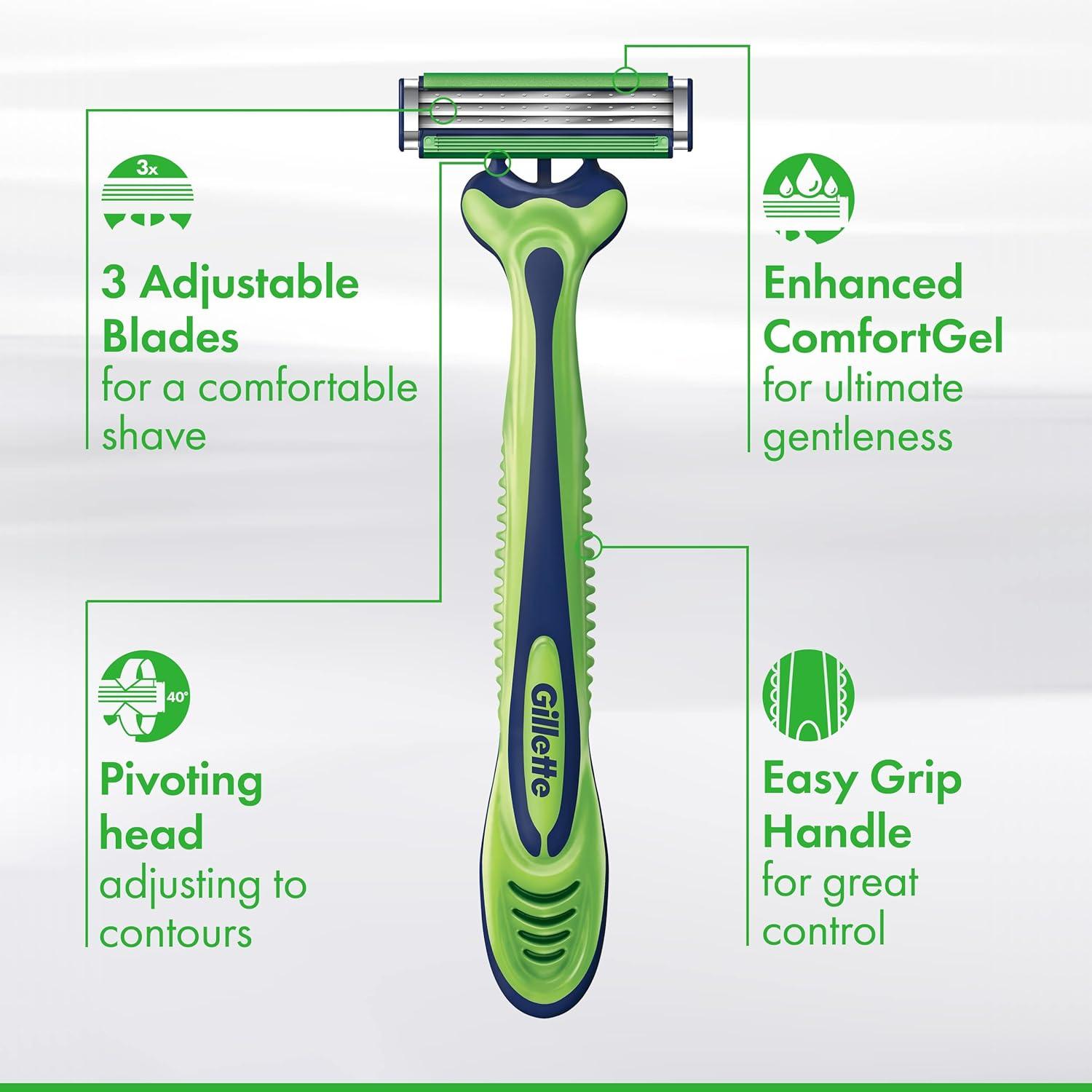 Looking for a men's disposable razor that can get you up to 10 comfortable shaves? Gillette's Sensor3 Sensitive disposable razors do just that thanks to its 3 chromium-coated, skin sensing blades and a 40 degree pivoting head that automatically adjusts to the skin's surface to give a close, smooth and comfortable shave. Additionally, the skin-guard fins have five elastomer fins that gently stretch the skin to create a smooth, even surface for an optimal shave. Each razor can last up to 10 comfortable shaves. Sensor3 disposable razors for men feature an enhanced Lubrastrip with water activated Comfortgel technology for ultra-gentle shaving on your sensitive skin. Complete with an ergonomic shaped non-slip rubber handle for great control and maneuverability and easy rinse blades for 100% better rinsing (vs Sensor2 Plus disposable razors). See why Gillette Sensor3 Men's Disposable razor is the world's #1 selling 3 blade disposable razor*. For best results, use with your favorite Gillette shave gel, cream or foam. *Based on Nielsen sales data among 3 bladed male disposable razors.