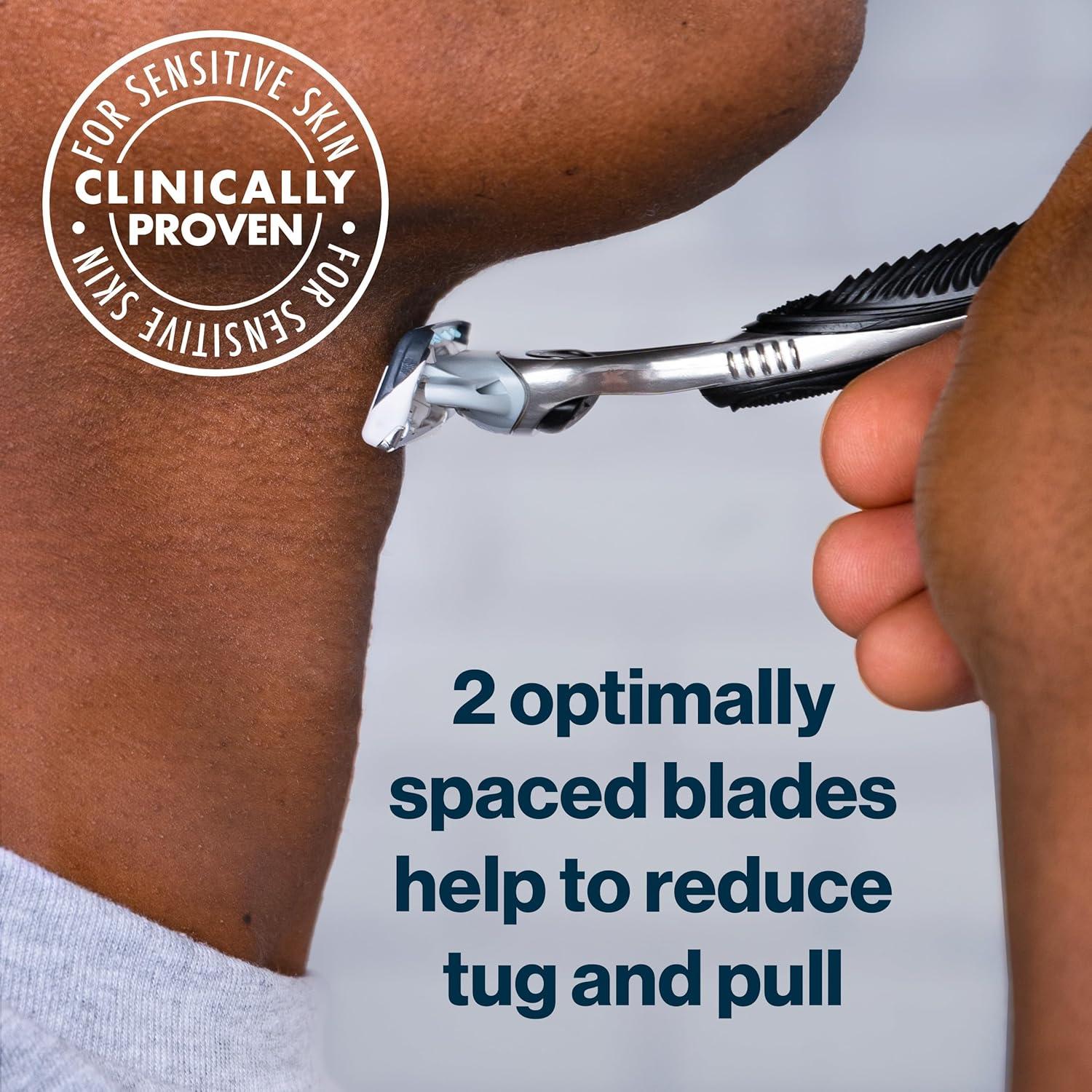Our Gillette SkinGuard razor blade refills are clinically proven for sensitive skin with the SkinGuard feature that smooths your skin and protects it from the blades. It is designed to stop irritation with lubrication before and after the blade, working to minimize tug and pull and cut hair at the skin level. The soft microfins gently smooth and stretch skin while the microcomb guides hair to the blade. These blade refills feature our thinnest blades and a precision trimmer which is perfect for hard-to-reach places and styling facial hair. Your shave will have the right blend of closeness to avoid potential irritations you may have experienced from other razors. This may be a bit different from the Gillette shave you’ve experienced in the past but you will still get a great shave that helps stop irritation and razor bumps. SkinGuard blade refills fit all SkinGuard razor handles.